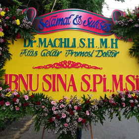 Salah satu, bunga papan selamat sukses kreasi kami adalah pesanan personal dari Bapak Ibnu Sina, S.Pi.M.Si, yang memberikan ucapan selamat gelar promosi doktor untuk Dr. Machli, S.H. M. H beberapa waktu lalu. Untuk lebih jelasnya, berikut detail dari keindahan papan bunga yang dipesan tersebut.